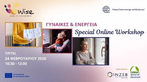Η Κοινωνική Συνεταιριστική Επιχείρηση ΑΝΕΜΟΣ ΑΝΑΝΕΩΣΗΣ και το ΙΝΖΕΒ προσκαλούν στελέχη και κοινωνικές υπηρεσίες Οργανισμών Τοπικής Αυτοδιοίκησης σε διαδικτυακή ενημερωτική συνάντηση και ανταλλαγή εμπειριών, στο πλαίσιο του ευρωπαϊκού έργου WISE – Women in Solidarity for Energy.