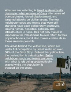 Εν τω μεταξύ, οι συνθήκες στη Γάζα είναι απελπιστικές. Πάνω από το 80% της Λωρίδας της Γάζας έχει καταστραφεί μετά από αδιάκοπους βομβαρδισμούς. Παλαιστίνιοι εξακολουθούν να ζουν μέσα σε σκηνές από πλαστικό ή πεθαίνουν κάτω από τα κτίρια που καταρρέουν. Ο εναπομείνας πληθυσμός της Γάζας υποφέρει μέσα στον βαρύ χειμώνα, με μόνο μια μικρή ποσότητα βοήθειας να επιτρέπεται να φτάσει στους αμάχους. Μωρά έχουν παγώσει μέχρι θανάτου. Άμαχοι σκοτώνονται εν ψυχρώ γιατί εκαναν το λάθος και πέρασαν λίγα μέτρα μέσα στην διαιρεμένη στο μισό Γάζα.