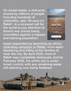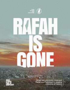 Σήμερα η καταστροφή είναι πλήρης. Η Ράφα που έχει ιστορία από την εποχή των Φαραώ έχει ισοπεδωθεί. Προσωρινα ο πληθυσμός της έφτασε το 1.400.000 ανθρώπους γιατί εκεί κατέφυγαν οι παλαιστίνοι από την πόλη της Γάζας και άλλες πόλεις που βομβαρδίζονταν ανελεώς.