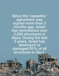 Παρά την λεγόμενη εκεχειρία, τα ισραηλινά στρατεύματα σκοτώνουν Παλαιστίνια παιδιά στον δρόμο καθώς μαζεύουν καυσόξυλα για να ζεσταθούν κατά τη διάρκεια ενός σκληρού χειμώνα που περνούν σε σκηνές. Ο αριθμός των νεκρών από τους ισραηλινούς βομβαρδισμούς συνεχίζει να αυξάνεται και τα βάσανα των Παλαιστινίων δεν δείχνουν να έχουν τέλος. Τις τελευταίες ημέρες, μόνο 5 Παλαιστίνιοι (από χιλιάδες) που χρειάζονταν επείγουσα ιατρική περίθαλψη έλαβαν άδεια να εγκαταλείψουν τη Γάζα – χιλιάδες άλλοι θα μπορούσαν να πεθάνουν περιμένοντας.