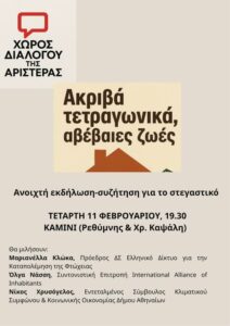 Την εκδήλωση για το στεγαστικό διοργάνωσε ο «Χώρος Διαλόγου της Αριστεράς» στον πολιτιστικό χώρο Καμίνι, στο Γαλάτσι, στις 11 Φεβρουαρίου.