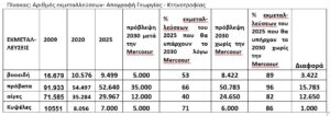 Από αυτόν τον Πίνακα προκύπτει ότι υπό κανονικές συνθήκες η μείωση των εκμεταλλεύσεων στα βοοειδή το 2030 θα ήταν στο 89% του 2025 ενώ με την Mercosur οι εκμεταλλεύσεις αναμένεται να πέσουν το 2030 στα 53% του 2015. Συνεχίζοντας με την ίδια λογική παρατηρούμε ότι χωρίς τη συμφωνία με την Mercosur οι εκμεταλλεύσεις με πρόβατα το 2030 θα ήταν στο 96% των εκμεταλλεύσεων του 2025 ενώ με την Mercosur πέφτουν στο 66%. Οι εκμεταλλεύσεις με αίγες αντί για μείωση στο 82% με την Mercosur πέφτουν στο 40%.Τέλος, οι μελισσοκομικές εκμεταλλεύσεις αντί για μείωση 86% με την Mercosur πέφτουν στο 71%.