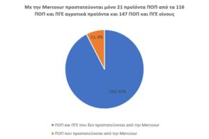 Η κυβέρνηση Μητσοτάκη υποστηρίζει τη συμφωνία της Ευρωπαϊκής Ένωσης με την Mercosur (2) και προβάλει στα ΜΜΕ ότι προστατεύει 21 ελληνικά προϊόντα ΠΟΠ. Ωστό αυτά αντιστοιχούν σε μόλις το 8% των ΠΟΠ και ΠΓτων ελληνικών αγροτικών προϊόντων (3) . Όπως είναι αναμενόμενο θα βρεθούν υπό απειλή από την Mercosur το 92% των παραγομένων ελληνικών ΠΟΠ και ΠΓΕ, που αφορούν σημαντικές τοπικές δραστηριότητες σε πολλές περιοχές της Ελλάδας (Διάγραμμα). Μελέτες σε επίπεδο ΕΕ έχουν δείξει ότι τα προϊόντα ΠΟΠ/ΠΓΕ πωλούνται έως και 2,85 φορές ακριβότερα κατά μέσο όρο σε σχέση με τα μη πιστοποιημένα προϊόντα, υπογραμμίζοντας την υψηλή προστιθέμενη αξία που δημιουργούν.