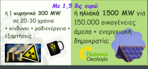 Η επιλογή της πυρηνικής ενέργειας είναι μια επιλογή ασύμφορη οικονομικά, επικίνδυνη για το περιβάλλον και την υγεία μας, μας καθιστά ευάλωτους σεσεισμούς, ατυχήματα και επιθέσεις. Αντίθετα, η επιλογή της επιδότησης φωτοβολταϊκών σε 150.000 στέγες κατοικιών σε όλη τη χώρα είναι πολύ πιο οικονομική, θα μας δίνει πενταπλάσια ενέργεια, θα ωφελήσει άμεσα 150.000 οικογένειες, χωρίς κίνδυνο για το περιβάλλον και την υγεία μας.